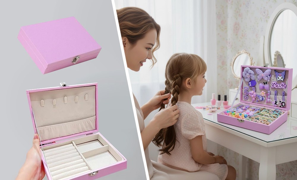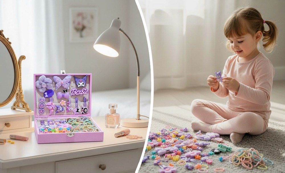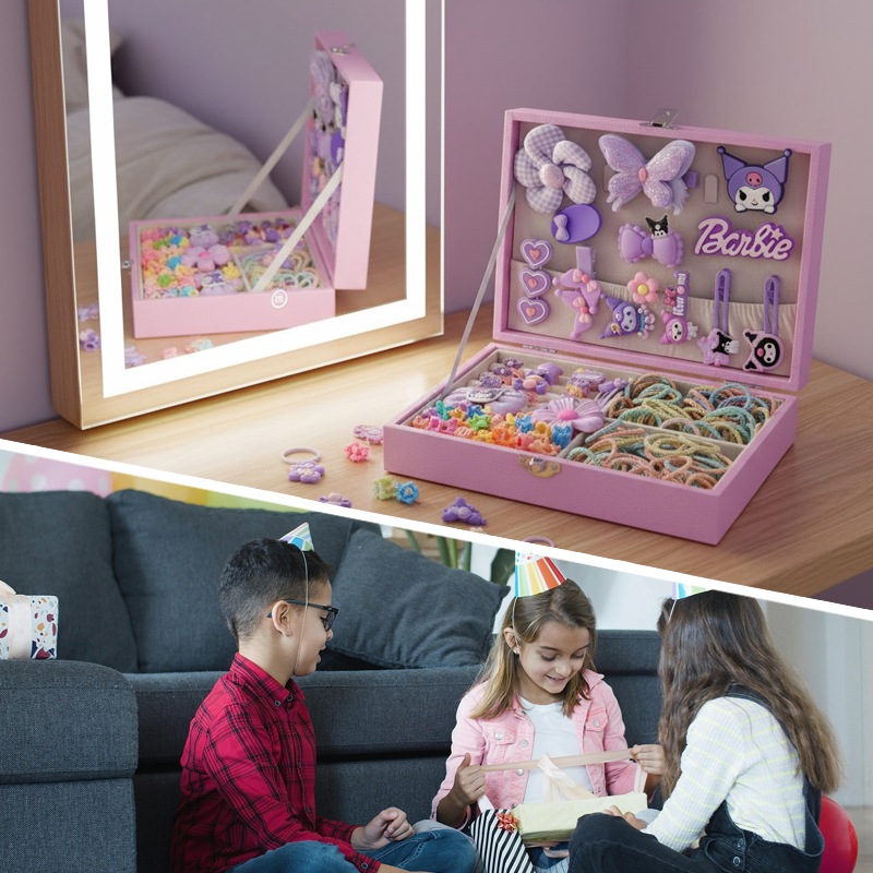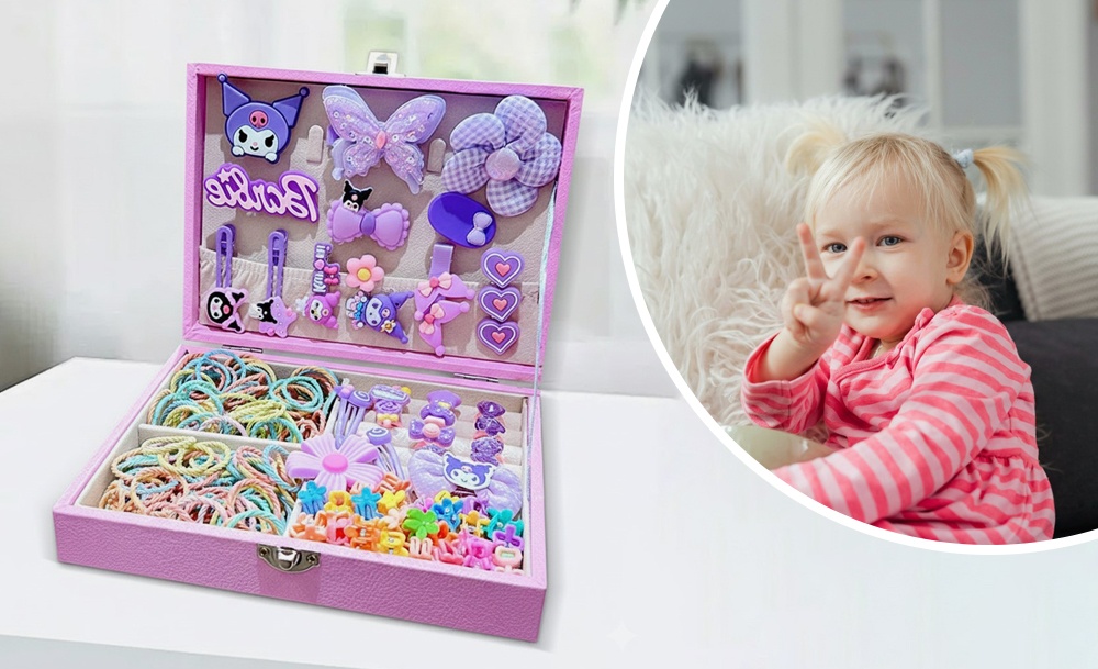 Все аксессуары размещены в многоуровневой коробке. Органайзер помогает поддерживать порядок и удобно хранить мелкие предметы. Набор идеально подходит для повседневного использования, а также для праздничных образов. Он развивает творчество и мелкую моторику при создании причесок. Аксессуары безопасны для детских волос.