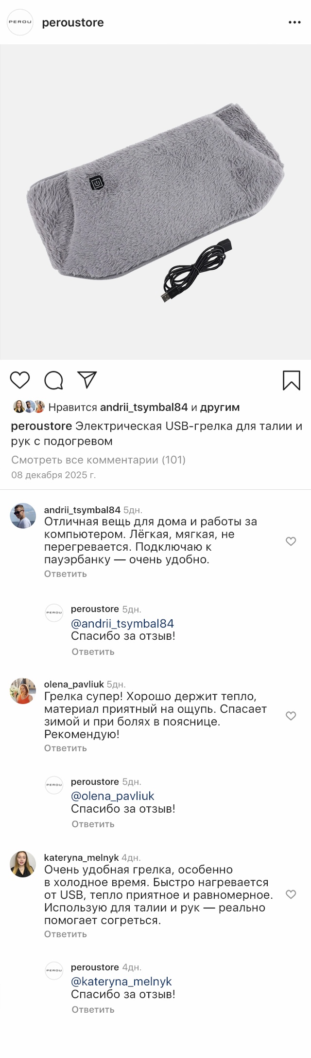 Грелка работает от любого USB‑источника – ноутбука, адаптера, повербанка, поэтому ее можно использовать как дома, так и на работе, а также брать в поездки. Компактная, легкая и универсальная, она превращает холодные дни в комфортную атмосферу и дарит ощущение уюта.