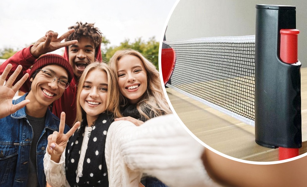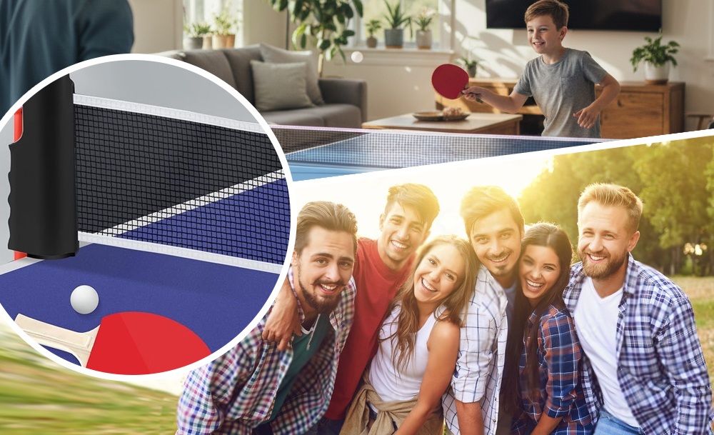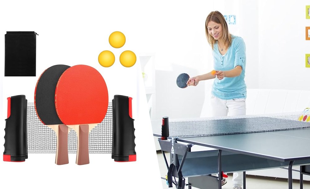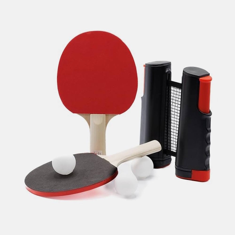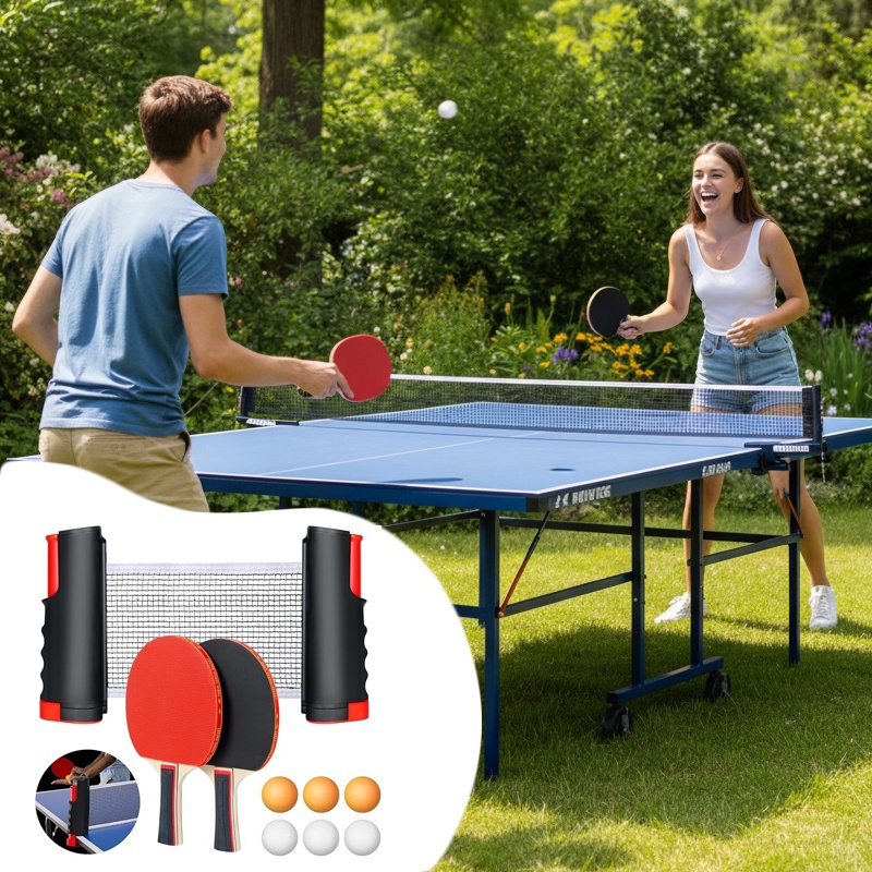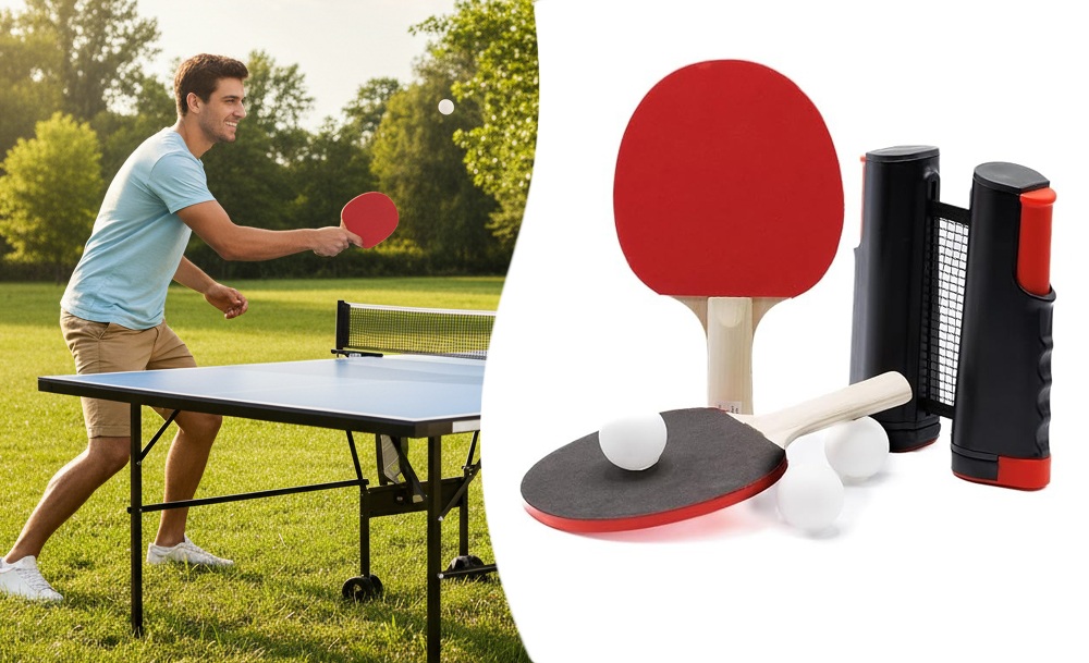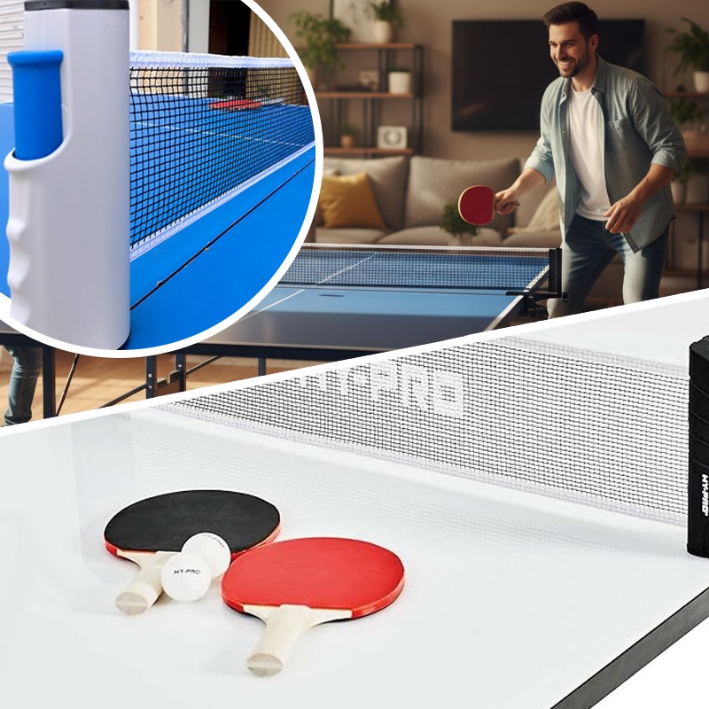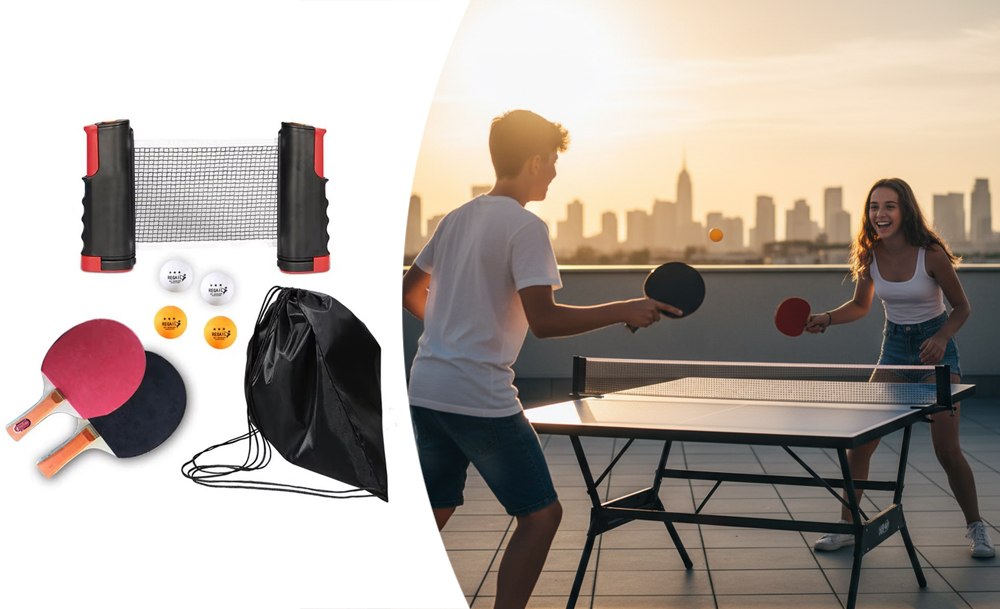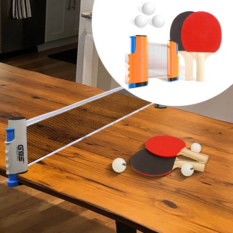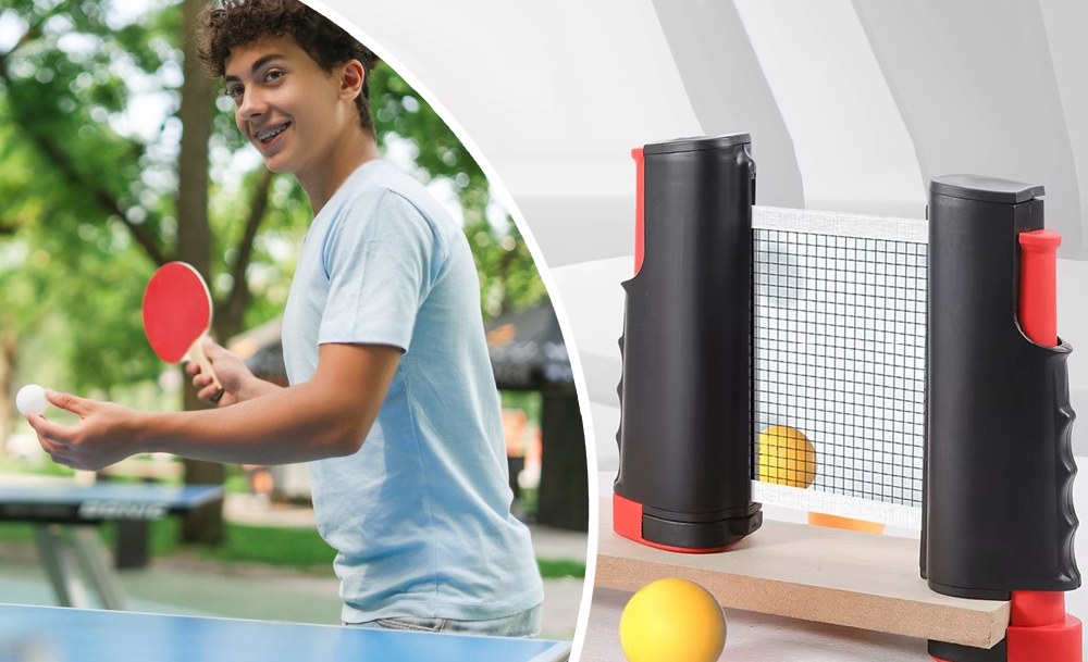 Портативный набор для настольного тенниса с выдвижной сеткой, ракетками и мячами — это удобный комплект, который позволяет устроить игру в пинг-понг в любом месте. Сетку можно быстро развернуть на любой подходящей поверхности. Она легко фиксируется и также просто складывается обратно.