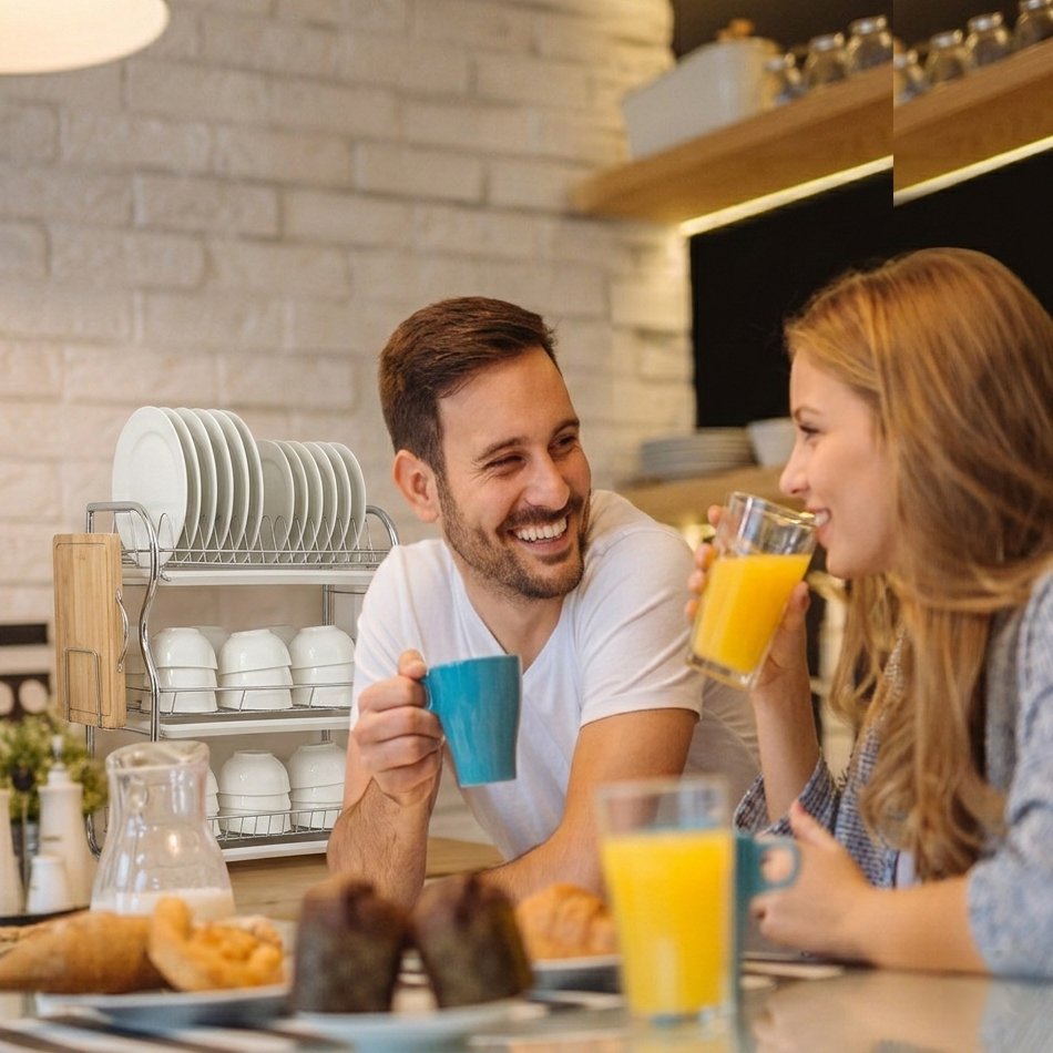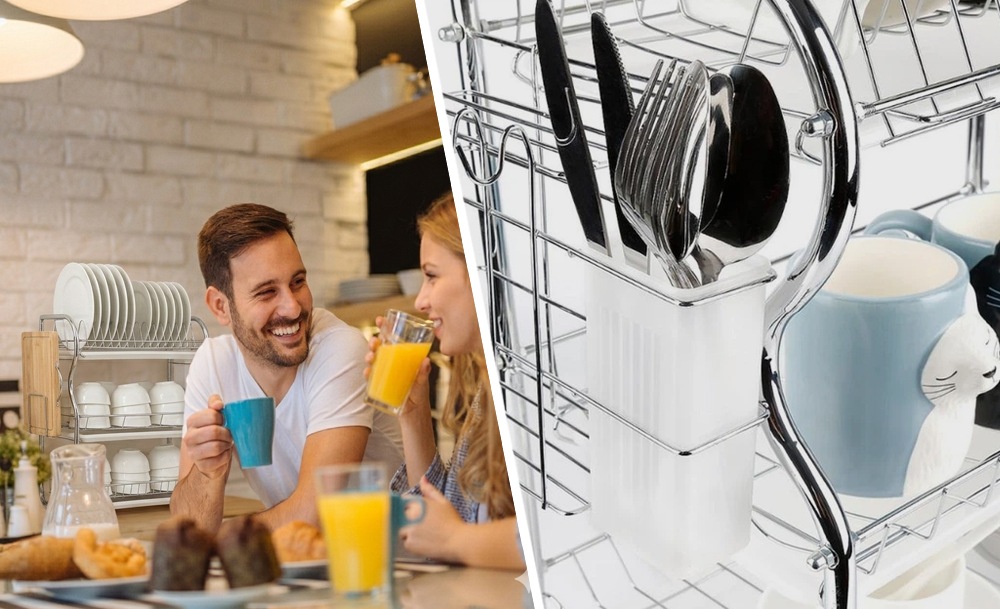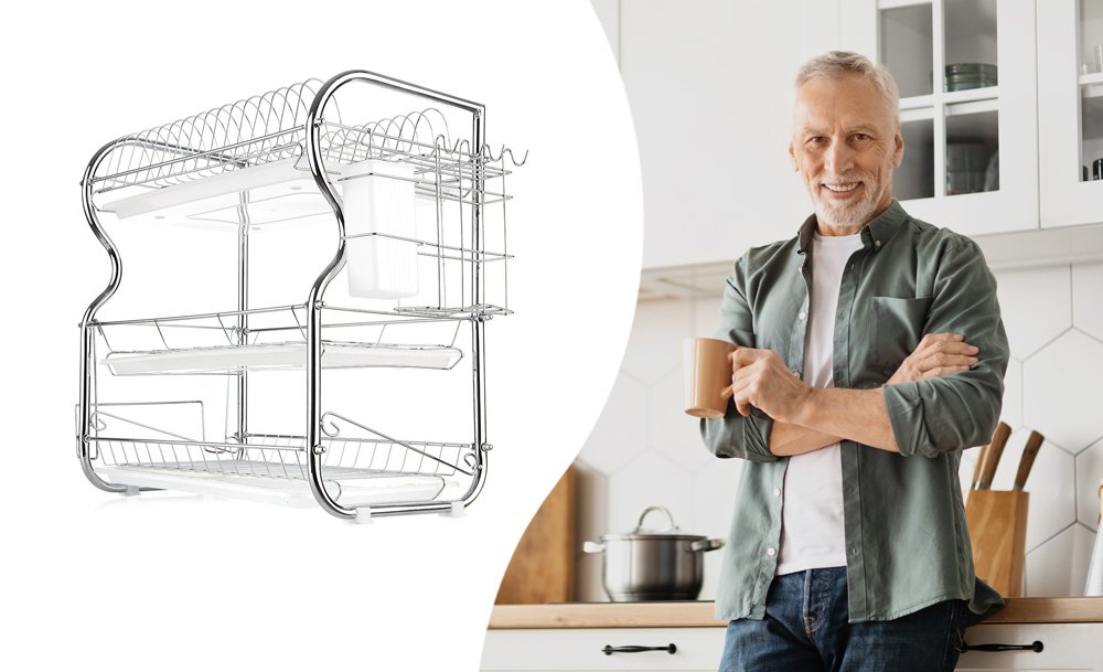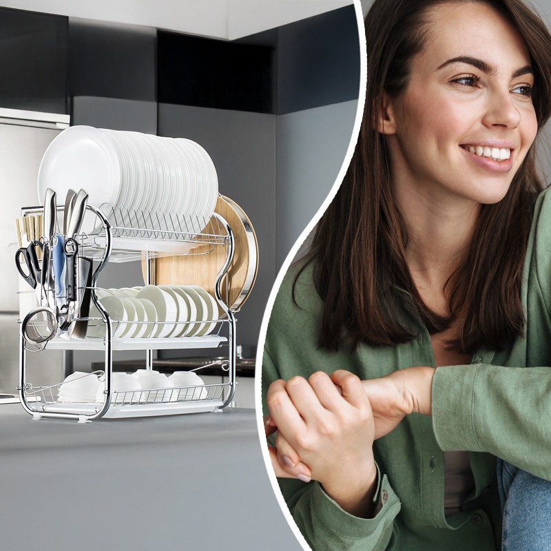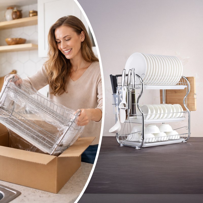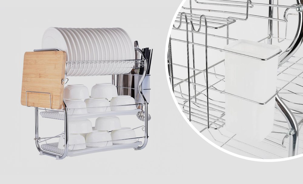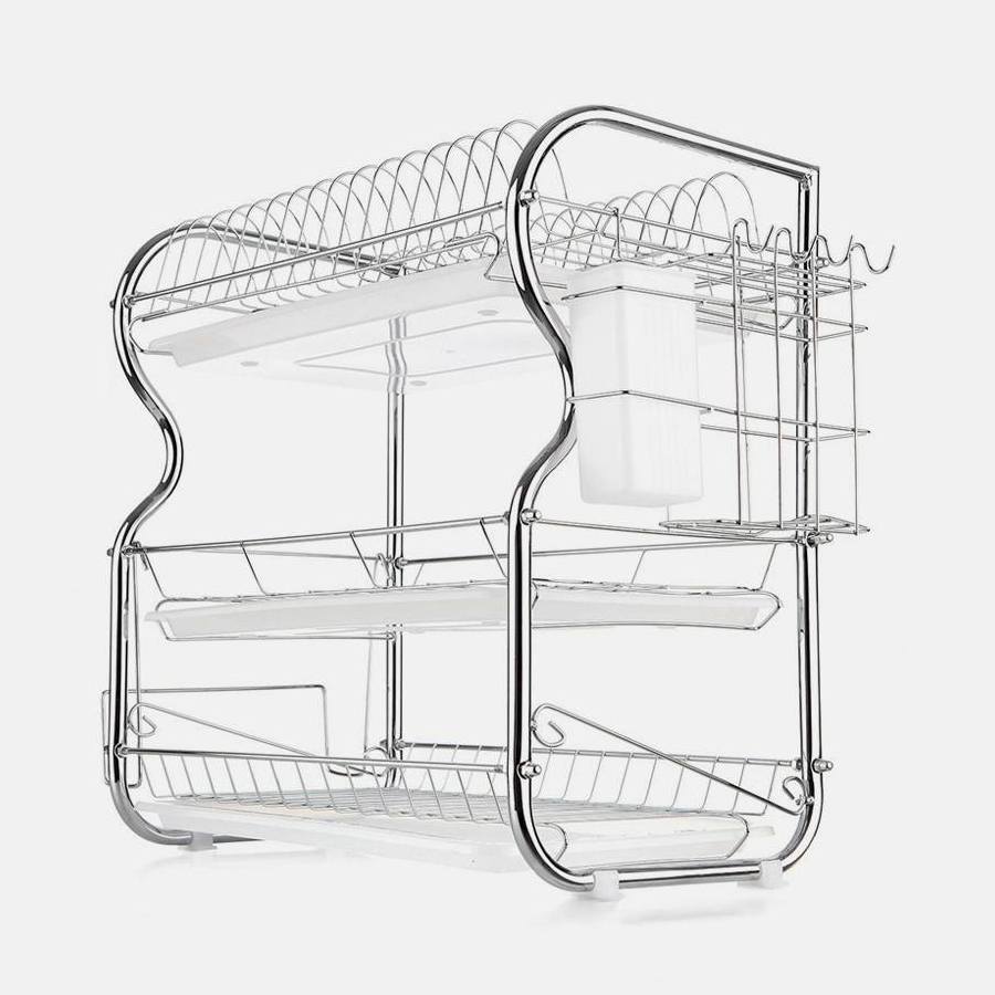 Трехъярусная сушилка-органайзер для посуды и столовых приборов – практичное решение для современной кухни. Многоуровневая конструкция позволяет компактно разместить тарелки, чашки, миски и столовые приборы, экономя пространство на столешнице.