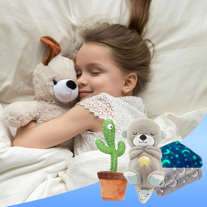 Комплект із дихаючої видри зі світлом та музикою, плед-покривало, що світиться та танцюючого співаючого кактуса — ідеальне рішення для дитячих ігор та затишного відпочинку. Видра м’яко заспокоює, випромінює світло та грає мелодії, допомагаючи дитині розслабитися перед сном.