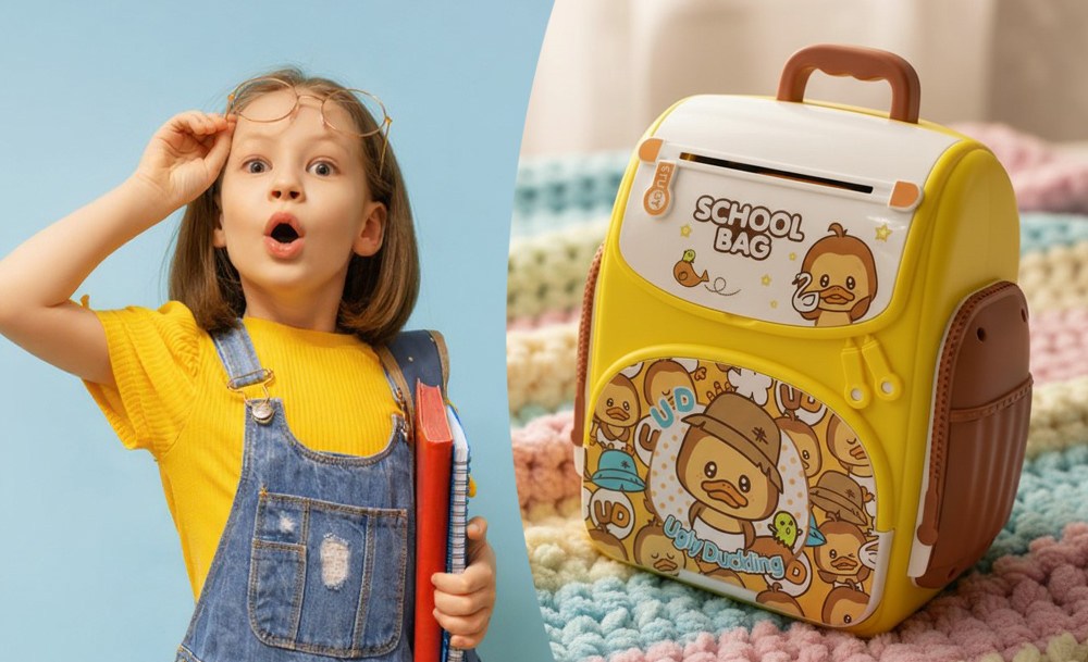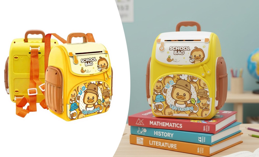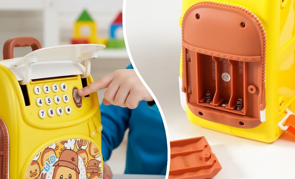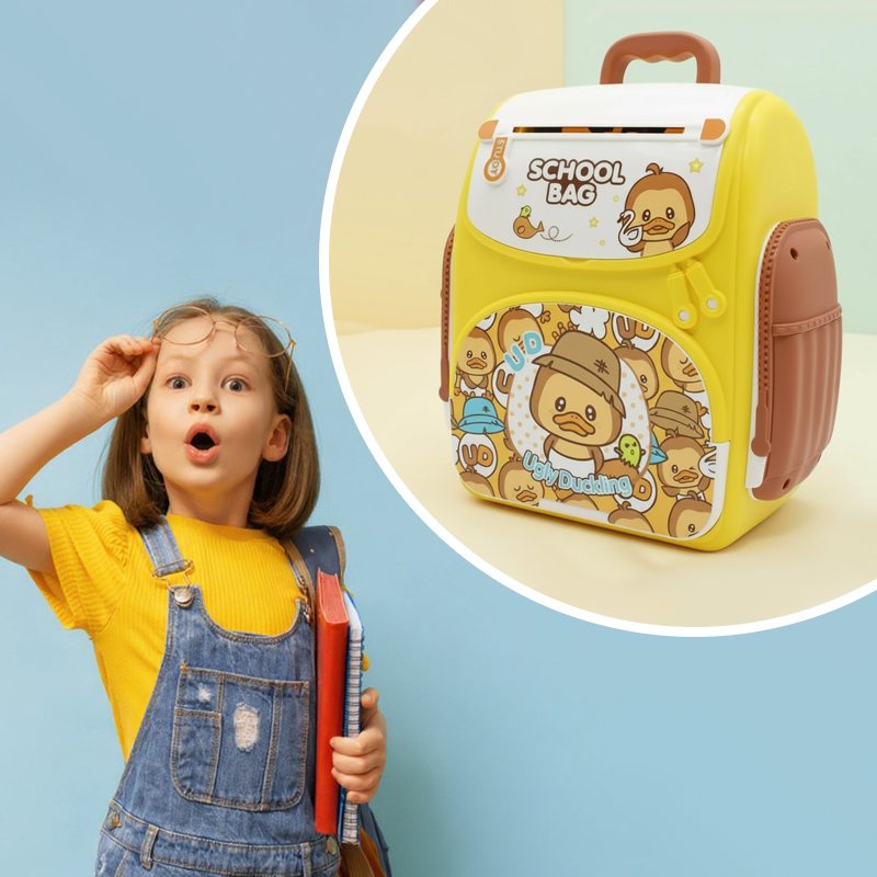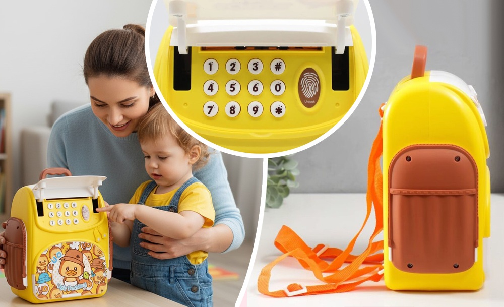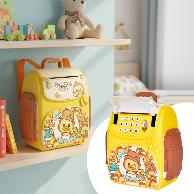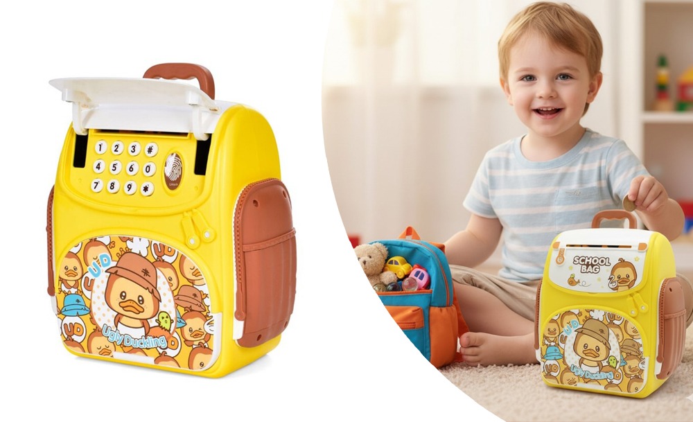 Ця скарбничка-рюкзак “Ugly Duckling” з барвистим дизайном здивує будь-яку дитину! Адже це не не просто скарбничка — це справжній дитячий сейф, який перетворює накопичення на захопливу гру. Головною особливістю скарбнички є функція автоматичного затягування купюр, що імітує роботу справжнього банківського термінала.