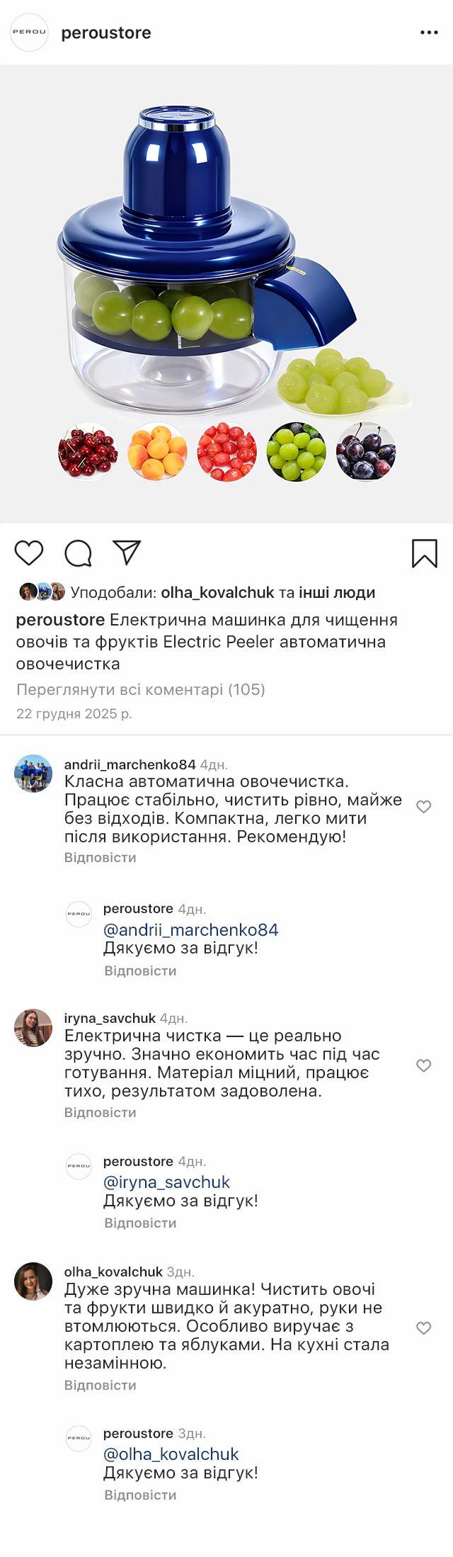 Управління гранично просте: одне натискання – і овочечистка сама робить всю роботу. Оброблені овочі та фрукти автоматично виходять назовні. Конструкція легко розбирається та швидко миється, що гарантує гігієнічність після кожного використання. Машинка ідеально підходить для дому, дачі, пікніків і навіть для професійної кухні.