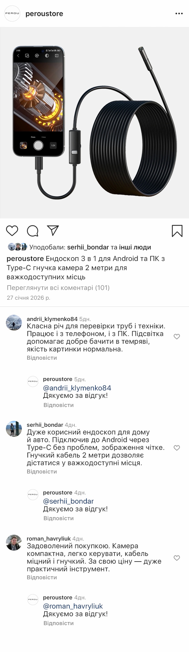 Гнучкий кабель дозволяє легко зазирнути в вузькі щілини та недоступні куточки, а висока якість зображення гарантує чітку картинку в реальному часі. Компактний та зручний, цей ендоскоп перетворює складні перевірки на легку та безпечну задачу. Він ідеально підходить для ремонту, діагностики та огляду будь-яких об’єктів.