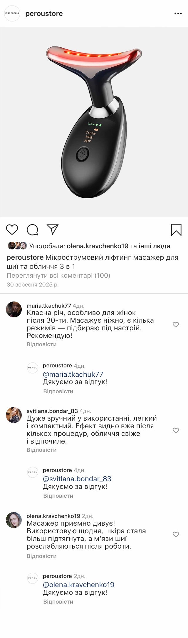 Цей пристрій поєднує мікрострумовий ліфтинг, термічну терапію та вібраційний масаж, забезпечуючи комплексний догляд за шкірою обличчя та шиї. Він активує м’язи, стимулює синтез колагену, зменшує прояв дрібних зморшок і допомагає відновити чіткість овалу обличчя. При регулярному застосуванні масажера підвищується пружність і тонус шкіри, а також покращується засвоєння косметичних засобів.