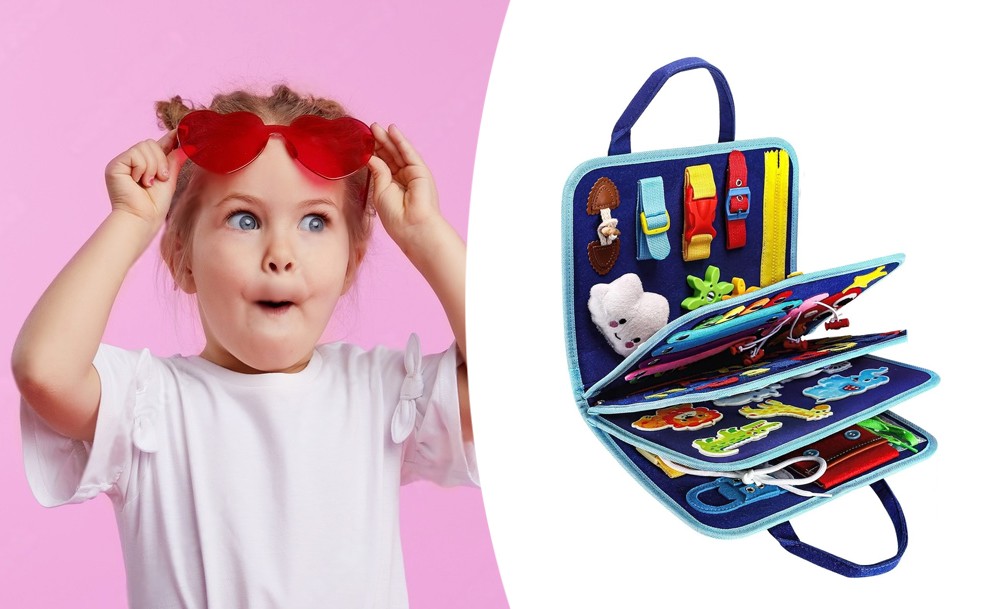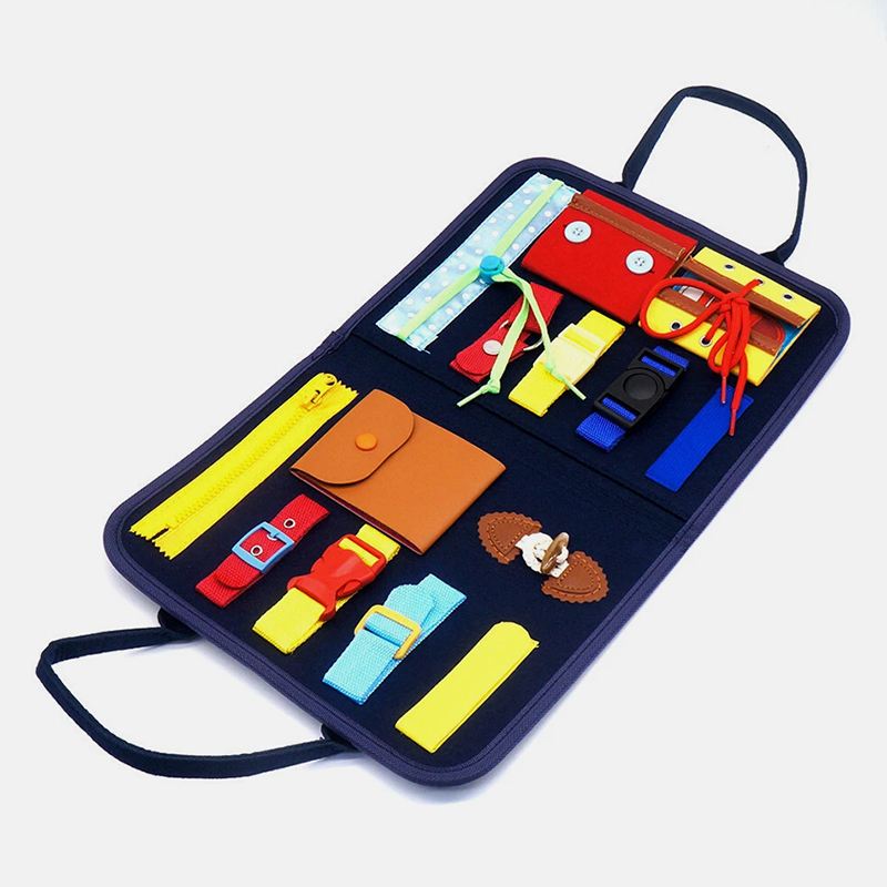 Монтессорі розвиваюча сумка-дошка Busy Board — це яскрава та захоплююча іграшка, яка допомагає малюкам розвивати моторику, логіку та увагу. Кожна деталь дошки продумана так, щоб дитина могла вчитися застібати блискавки, кнопки, пряжки та шнурки, тренуючи при цьому пальчики та координацію.