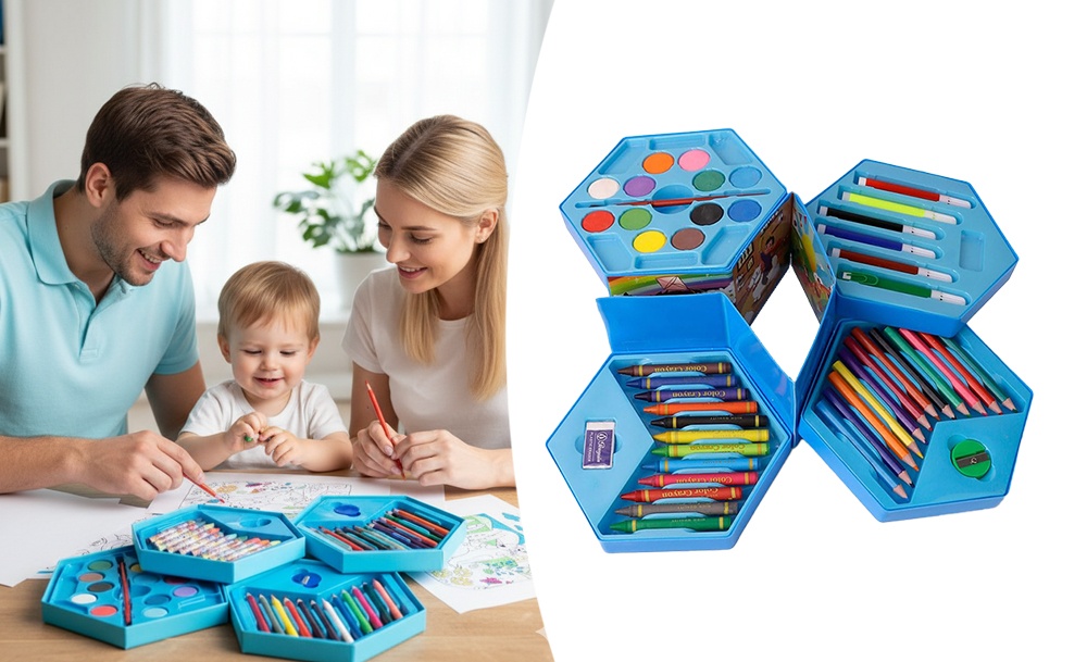 Цей універсальний набір пропонує 46 інструментів для юних художників і художниць. У ньому зібрані основні матеріали для малювання та розфарбовування. Набір розміщений у зручному кейсі для зберігання та транспортування, що допомагає організувати робоче місце.