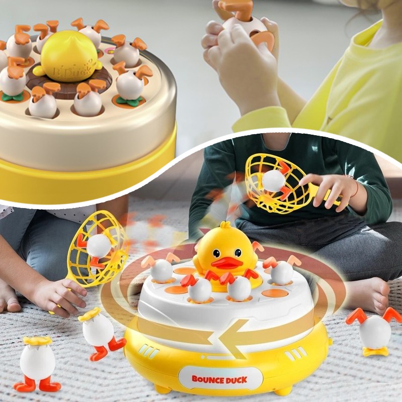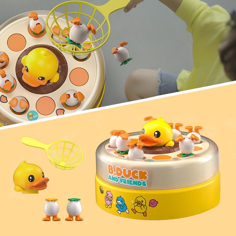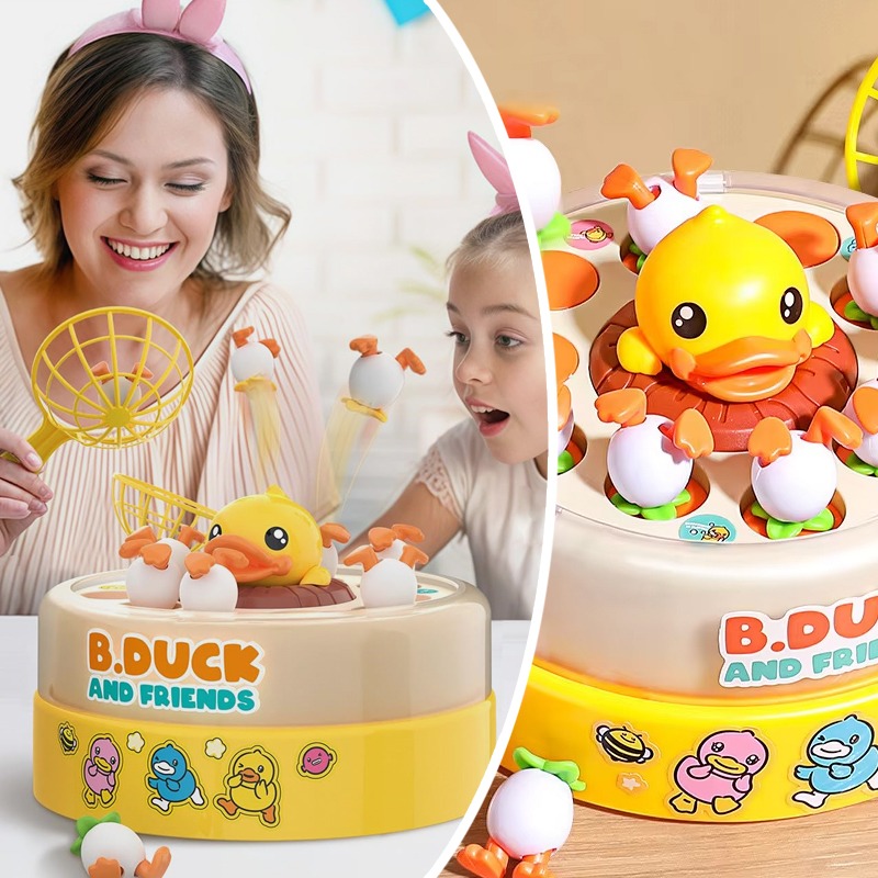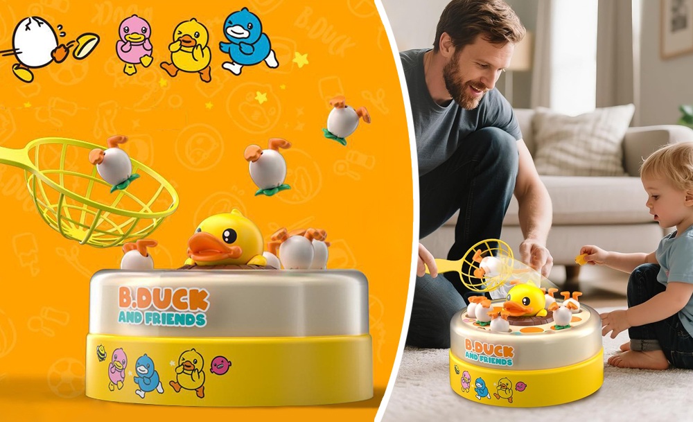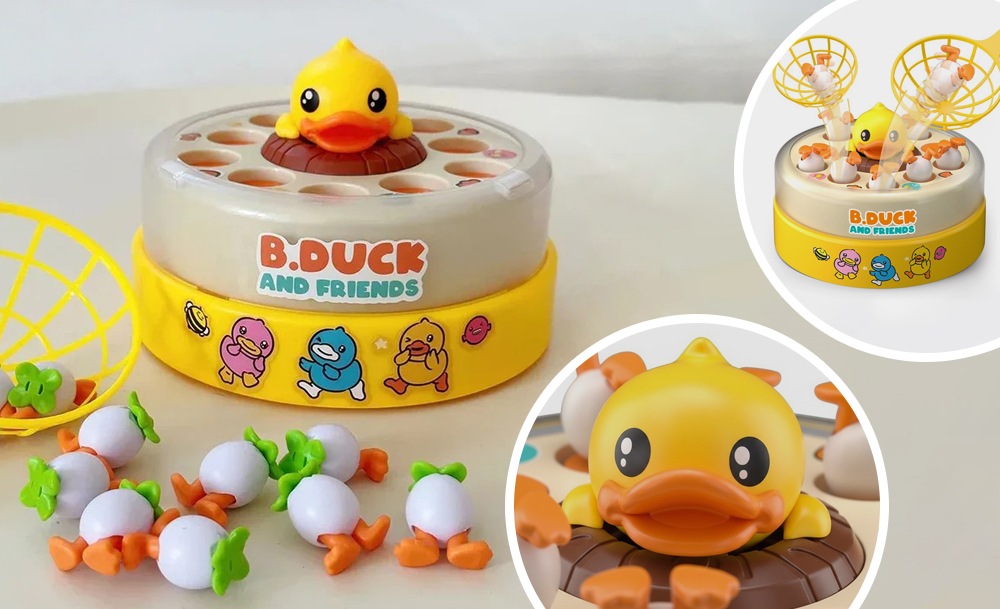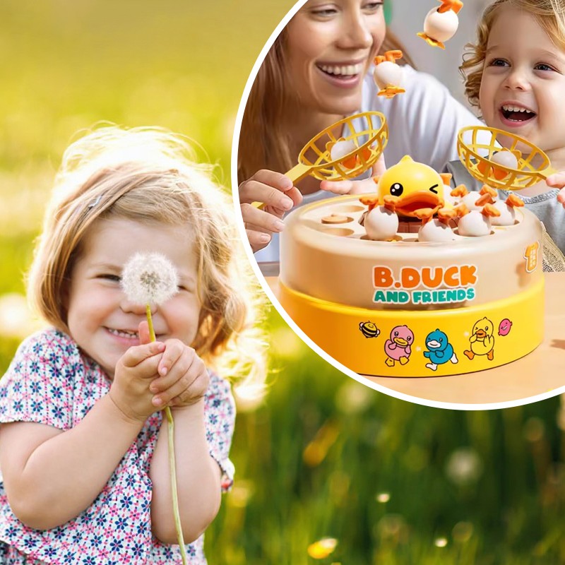 Каченята раптово вистрибують із ігрового поля, а завдання дитини – впіймати їх якомога швидше за допомогою сачків. Це покращує координацію рук і очей та точність рухів, а також навчає блискавично приймати рішення в умовах непередбачуваності.